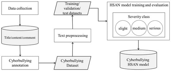 Flowchart of the proposed HSAN method for cyberbullying severity classification.