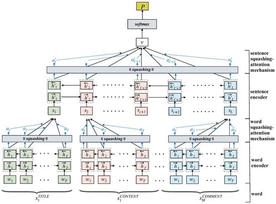 Before model training, all the text was transformed into dense vectors to obtain indices for representing the corresponding terms. Two terms, namely “PAD” and “UNK”, were used for text encoding processing. “PAD” represents the extra words used to create a dense vector because the feature input of the neural network model required a matrix of batch samples. All the terms in the training set were used to construct a vocabulary dictionary and transform the terms to indices with dense vectors in the training, validation, and test sets. Moreover, an unknown term (not in the vocabulary dictionary) in the validation, and test sets were replaced with the “UNK” term. For example, consider a dialogue consisting of L sentences, where each sentence contains T words. Suppose that w is expressed as a word in a sentence x, where . The sentence of title is , the sentences of content are , and the sentences of comments are . Thus, the total number of sentences is , where C is the number of sentences of content and the M is the number of sentences of comment.