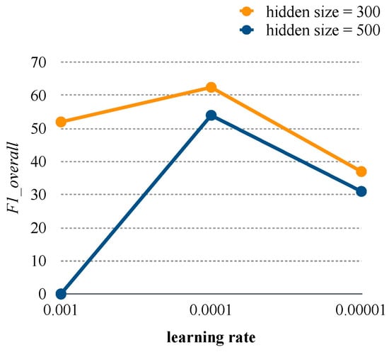 The values under the six parameter combinations of hidden size and learning rate in the validation set for the HSAN are presented in Figure 4. The value of 0.0001 represents the optimal learning rate, and the value of 300 represents the optimal hidden size and word embedding size according to .