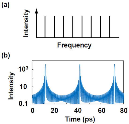 where v0 is a reference frequency, is the time-independent part of and the frequency differences between adjacent lasing modes are equal and given by the beat-note Δ (Figure 1a). One has a mode-locked pulse train (Figure 1b) when in addition in Equation (2), and the phases are equal, i.e.,