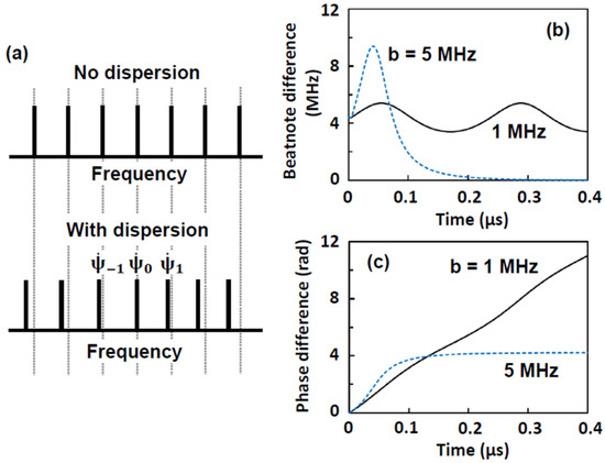 (a) Effects of dispersion on the passive cavity modes. Numerical integration of Adler’s equation giving time evolution of (b) beat-note difference and (c) corresponding phase difference . The parameters are a = 4.4 MHz, b = 1.0 MHz and 5.0 MHz (solid and dashed curves, respectively).