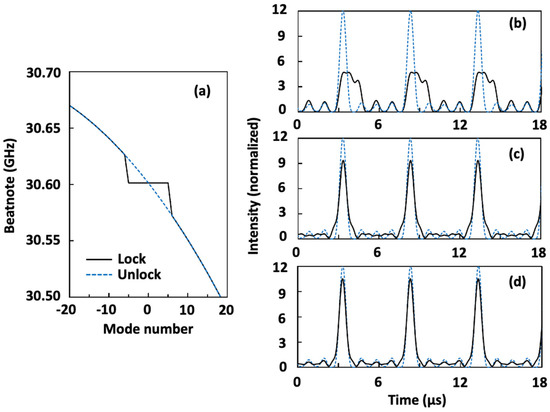With b ≥ 5.0 MHz, one obtains Equation (2) for −5 ≤ n ≤ 5. Figure 3a shows the modification to the beat-note, with the creation of a flat section (lock band) between n = −5 and 5. A Fourier transformation of will show an infinitely narrow resonance at the radio frequency (RF) of 30.60 GHz, indicating a perfect frequency comb. However, a mode-locked pulse train may not result, as depicted in Figure 3b, because the condition specified by Equation (3) is unsatisfied. It is only by increasing the locking coefficient b to reduce the differences in phase, as given by Equation (5), that the pulses approach the transform limit (see Figure 3c,d).