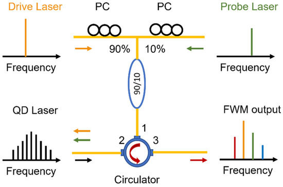 In this paragraph, FWM experiments are performed on both QD and QW lasers. The QD Fabry–Perot (FP) laser is directly grown on silicon. Further details about the structure have already been published elsewhere [12]. The QW laser is a commercial FP laser provided by Almae Technologies. Figure 4 depicts the experimental setup for the nondegenerate pump–probe FWM operation. To maximize the FWM efficiency, two single-frequency tunable sources with narrow linewidths serve as the drive and the probe photons. The outputs of those two pump photons are firstly incorporated by a 90/10 fiber-based optical coupler, and then they are sent into the QD or QW laser from port 1 to port 2 of an optical circulator and a lens-end fiber. To further maximize the frequency conversion efficiency, the polarization controllers are added into the paths of the drive and the probe sources to align the polarization of these two pump photons with that of the QD/QW laser. To eliminate the back reflections from the setup, the isolation between port 2 and port 1 of the optical circulator must be higher than 30 dB. The output of the FWM light is finally coupled out from port 2 and it is sent to a high-resolution optical spectrum analyzer (OSA) through port 3. The measurements are performed at 25 °C, which is controlled by a thermoelectric cooler. Depending on the frequency of the drive and the probe photons, and , respectively, the FWM operation includes two processes. The Stokes case takes place when the frequency detuning is negative, whereas the case for anti-Stokes occurs at the positive frequency detuning condition.