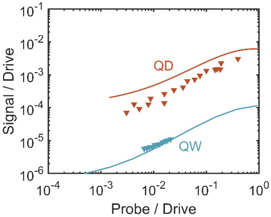 Benefiting from the three-dimensional charge carrier confinement in QDs, the enhanced third-order nonlinear susceptibility gives rise to the improvement of FWM efficiency. In this study, the FWM efficiency is determined by the relationship between the ratio of the signal power to the drive power rsd and the ratio of the probe power to the drive power rpd. Figure 5 displays the calculated rsd as a function of the rpd for an epitaxial QD laser on Si with p-modulation doping in the active region (solid burgundy line) and for a commercial QW laser (solid jade line), with the frequency detuning in the Stokes condition and the bias current fixed to twice the threshold. The calculated dependencies are performed with multimode semiclassical laser theory. The optical nonlinearities are analyzed based on a microscopic level model containing quantum mechanical electron–hole polarization. The theory gives access to the active medium nonlinearities, contributing to gain saturation, mode competition and multi-wave mixing [17]. In particular, it provides the FWM efficiency, which is plotted in Figure 5. The corresponding experimental results are performed by the different markers in the same colors. Despite the fact that the FWM efficiency of the QD laser has not attained its theoretical limit yet, it is still more than 10 times higher than that of the QW device. This remarkable improvement results from both the enhanced third-order optical nonlinearity and the p-type doping, whose presences contribute to the increase in the intensity of the signal photon in the QD laser [17]. Central to single-section ML lasers is the self-mode-locking mechanism allowed by four-wave mixing in the gain medium itself. The improved susceptibility in the QD laser is sufficient to produce stable, sub-picosecond mode-locked pulse trains in InAs QDs grown on Si. However, one clearly sees that both the susceptibility of four-wave mixing and the signal gain are noticeably lower than those of QDs.