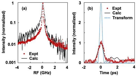 Here, we give an example of the insight gained into experimental device performance by comparing experiment and theory. The device is a single-section InAs QD laser still epitaxially grown on silicon, with device parameters available in Refs. [12,22,27]. In Figure 6, the red curves are from measurements and the black curves are from numerically solving Equations (6), (8) and (9). The operating current for the experimental spectrum (red curve) and the calculated spectrum (black curve) is 14 times and 10 times the threshold, respectively. The calculated RF linewidth is 143 kHz, compared to the 100 kHz measured value (Figure 6a). There is also good agreement on the measure pulse shape (Figure 6b), where fitting with a sech pulse shape gives approximately 500 fs of pulse duration [28].