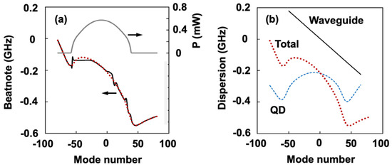(a) Effects of mode locking on beat-notes. The solid black curve is the beat-notes spread over the lasing spectrum (thin black curve). The red dotted curve is the variation in beat-note in the absence of mode locking. The solid gray curve is the mode intensities. (b) The red dotted curve is the total variation in beat-notes (same as in a). The contributions to it are from the GaAs waveguide (solid black curve) and InAs QD carrier-induced refractive index change (blue dashed curve).