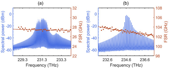 Optical spectrum (blue) and corresponding free spectral range (FSR) as a function of the longitudinal mode frequency (red) for (a) QD and (b) QW laser. The red solid lines are guiding lines for the FSR variation. Both devices operate at twice the threshold current.