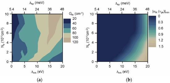 Fortunately, with quantum dots, the carrier-induced refractive index may be minimized with the laser design. Experiments and calculations with the linewidth enhancement factor αH found that QD lasers may be configured to operate with vanishingly small carrier-induced refractive index changes. The mapping shown in Figure 11a depicts the threshold gain at gain peak Gth as a function of the inhomogeneous width Δinh and the p-dope density Np. The corresponding mapping of the minimum linewidth enhancement factor at gain peak with the same combinations is shown in Figure 11b. The calculated results show that a sizable region with a zero linewidth enhancement factor at the gain peak for combinations of inhomogeneous linewidth, p-dope density and threshold gain are reachable by present QD lasers.