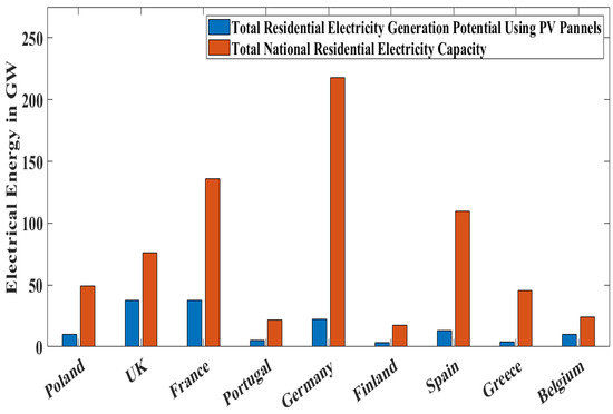 Residential PV electrical generation potential versus the total national electricity generation capacity in the EU.