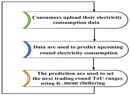 The aim is to dynamically set the ToU peak and off-peak ranges. Based on past consumers’ electricity consumption data available on the shared ledger blockchain, future electricity consumption predictions are then made, using the GRU model, subsequently, the ToU ranges for the next trading round are set by performing K-mean clustering on the blockchain as illustrated in Figure 2. The purpose behind it is to have a transparent, decentralized dynamic demand response.