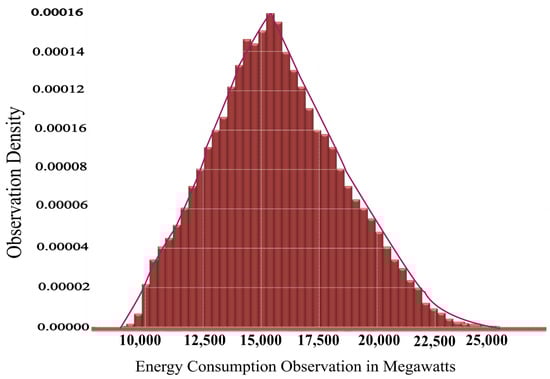 Our forecasting model is using an open-source dataset from PJM, in Megawatts [62]. The data consist of hourly records of electricity consumption in the USA for a period of time ranging from 31 December 2004 to 1 February 2018. They are structured into double columns of 121,274 values with no empty values. The energy consumption histogram provided in Figure 3 shows a normal distribution and hence, normalization of the dataset is not required.