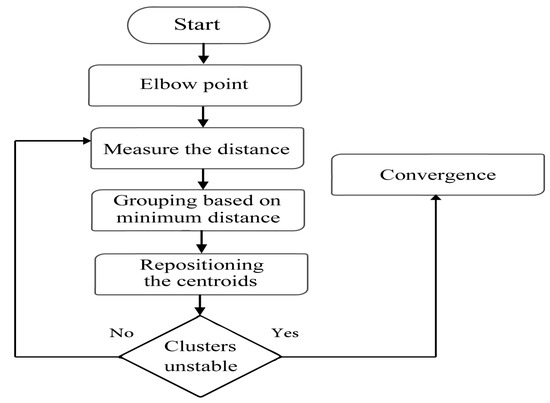 What is proposed, is that the energy ToU ranges and tariffs are defined ahead of each trading round; the tariffs are then defined accordingly in the smart contract arbitrating the interactions between the provider and the set of consumer clients. The novelty is that the clustering is implemented and performed on a smart contract. Interestingly, smart contracts are seen not to be suitable for implementing heavy computational algorithms due to code execution cost, which is abstracted in terms of gas. However, implementing a clustering algorithm to define ToU ranges on a smart contract is interesting in the sense that this would permit further decentralization, where ToU ranges are defined by a smart independent entity, ensuring their integrity and transparency. For this purpose, the K-mean clustering algorithm was implemented with K = 2 for two clusters, which are the electricity demand peak and off-peak, on a Solidity smart contract. It was compiled and tested on a Remix IDE platform to define ToU ranges on both predicted and real electricity consumption, for each round. The smart contract execution cost was also assessed and benchmarked to the execution cost of other decentralized applications’ smart contracts presented in other published works. The aim is to assess if performing K-mean clustering on a smart contract is realistic in terms of gas consumption. The K-mean algorithm flowchart is illustrated in Figure 6.