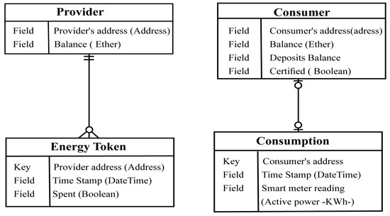 The DSO: also referred to as a utility owner company. The abstraction of the interacting entities is illustrated using the Entity Relationship Diagram ERD in Figure 7. However, these entities are not stored in a traditional database, but rather, they are represented by the state of the smart contract in which they are defined. The state of the smart contract is modified upon a successful call of its functions and is stored in the blockchain shared ledger. Each entity is assigned to its corresponding field through an appropriate mapping.