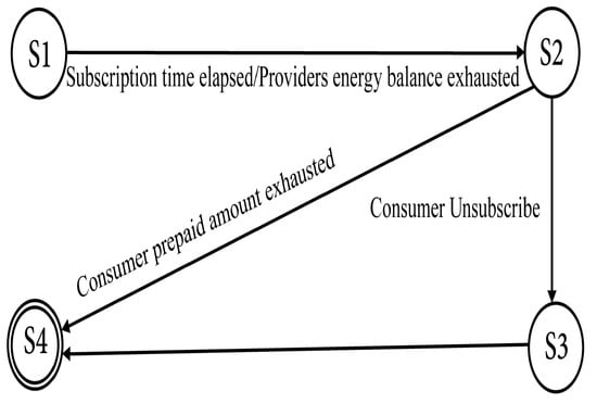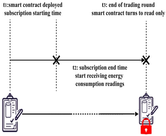 Smart contract 2 (Provider): The contract is deployed by the provider ahead of each trading round; it contains the ToU pricing for electricity consumption. Once deployed, consumers have to subscribe to the trading round during a defined period of time, by depositing money corresponding to the amount of electricity they wish to consume. The reason a deadline for subscription is defined, is that receiving a new subscription at any time can prolong the trading round indefinitely, which is not following the proposed scheme since electricity pricing is set according to prediction based on data collected during trading rounds. Each time a new subscription occurs, the smart contract checks the subscribing consumer account by calling Smart Contract 1; in case this is later certified and the provider still has enough energy balance to supply the new coming demand, the provider balance is updated accordingly, otherwise the subscription is denied. The smart contract stops accepting upcoming subscription requests if the subscription-defined time has elapsed, or if the provider has exhausted all his energy balance. The trading round then starts; it ends when all subscribing consumer deposit balance in the smart contract is zero. This time-dependent smart contract state is illustrated in Figure 8. Consumers’ electricity consumption data are uploaded to the smart contract. It is used to charge consumers as well as being added to the energy consumption dataset serving to train the prediction model as discussed in Section 4.1 above.