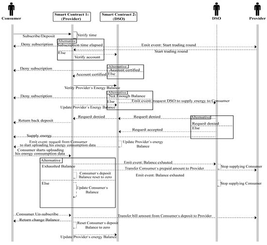 Moreover, the interaction and workflow between the platform agents are highlighted in Figure 9 and Figure 10. The respective responses are given in chronological order in Figure 9. When the trading round starts, all subscribers’ energy demand is supplied until prepaid amount exhaustion. In the case of a client’s premature un-subscription, he is charged according to his actual consumption and the change from his prepaid deposit is returned to him. The provider’s balance is updated as well, by setting back n spent tokens to unspent, where n represents the number of tokens corresponding to the change amount returned to the consumer.