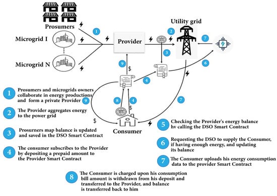Motivation: It is noticed through the review literature that in most of the proposed P2P energy platforms, the trading takes part between the prosumers and consumers. Prosumers’ energy is injected into the power grid, which is metered and tokenized. Tokens are created using an asset-based token protocol such as the ERC20 protocol in Ethereum. A token smart contract is created with a certain amount of total supplied tokens, which are set to have an abstracted value in terms of energy. Energy aggregated to the utility power grid (by the prosumers) is redeemed in the form of tokens, which are transferred to them. Tokens can then be traded according to their value in the market [26,27,28]. Accordingly, the initial smart contract defining the energy token is set with a total supply of tokens, which means, if new tokens need to be created, then, a new smart contract needs to be deployed with additional supply, which is very costly. The gas cost to deploy the EWT energy token is 1,274,198 with a cost of $171.62 [29]. Moreover, transferring tokens is costly as well. In addressing such gaps, we wish to consider in our paper that prosumers cooperate as a single provider and the energy they aggregate to the utility grid is tracked in a smart contract deployed by the DSO. This amount of energy is mapped to the issuer prosumer’s account as its energy balance. Instead of a token transfer, prosumers’ energy balance is updated by a mere contract call that updates a mapping, rather than a costlier financial token transfer. The energy balance of the prosumers represents the amount of energy the DSO owes them. Then, consumers can buy energy from prosumers. If the prosumer (seller) has enough energy balance to supply the demand, the payment is made from the consumer (buyer) to the seller set of prosumers. Consequently, the energy being sold is transferred from the DSO to the consumer as a debt that is paid back to the respective prosumer. His energy balance is then updated accordingly [30,31]. Mainstream token-based P2P energy trading platform bears another main drawback. In fact, in such a situation, the client does not pay per use for the energy he purchased. After the energy token is bought, it can be then redeemed as energy. However, the respective corresponding energy amount is transferred to the client and he is charged accordingly, regardless of to which extent the purchased energy is consumed. Additionally, most of the time, purchased energy is not consumed to the fullest [23]. It is as worth mentioning that some substantial research papers have been also conducted using smart contract-based electricity consumption billing system, outside the context of P2P energy trading, where household electricity bills’ computation and payment are monitored by a smart contract in a traditional centralized DSO–client architecture [32,33,34]. In this perspective, we proposed in our research paper, a platform where consumers are billed per consumption in the same fashion the DSO bills its consumers.
