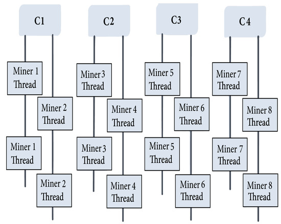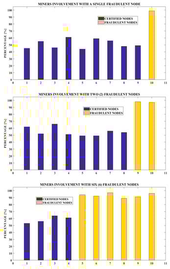 According to Table 3, the deduced Tthreshold is 39 ms. To test the proposed mining protocol and assess its performance, it is executed on 10 different threads running concurrently on the same machine, as depicted in Figure 12. Each thread represents a miner. Fraudulent miners’ nodes are represented by threads running mining protocol with less difficulty, to act as nodes having more hashing power. In the testing experiment, the certified miners are represented by threads mining with difficulty 5, whereas fraudulent miners are represented by threads mining with difficulty 4. The experiment consists of running the threads for 100 rounds corresponding to 100 blocks. The number of fraudulent miner nodes goes from a single node to 6 nodes representing more than 50% of the network. Threads with the shortest execution time in a round represent nodes successfully mining the new block for that particular round. If thread execution time is less than the accepted minimum threshold, its execution time is set to be Tthreshold.