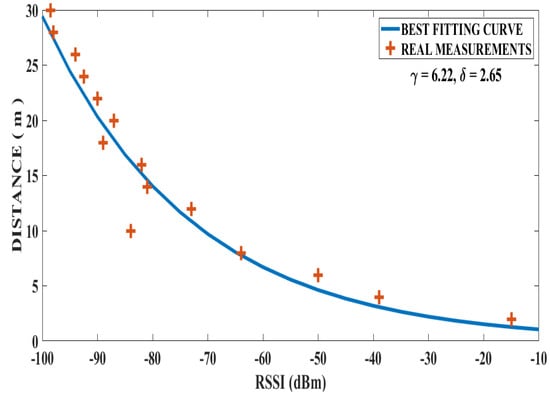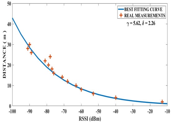 The mean standard deviation for device 1 is 2, whereas it is for device 2. By fixing for each device, the next step is to deduce for each one of them using best fitting curve method between the set of distances and the set of corresponding RSSI mean averages , using Equation (5). This is depicted in Figure 19 and Figure 20.