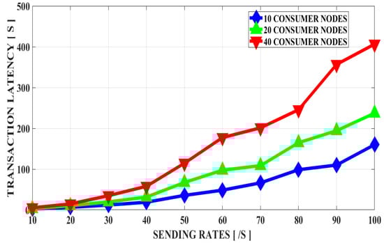 Transaction’s latency with increasing send rates for different numbers of consumer node.