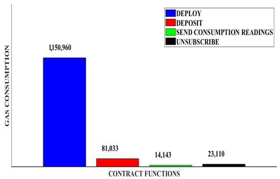 To assess the performance of the Proposed platform, an Ethereum private blockchain has been set on a machine having 4 cores CPU: Intel(R) Core(TM) i5-9300H CPU @ 2.40 GHz and a GPU: NVIDIA GeForce GTX 1650 with Max-Q Design. It is worthy to mention that the purpose of the experiment is not to validate the functioning of the platform, since it has been already accomplished during the development stage on Remix IDE. We decided to put the focus on evaluating its performance when increasing subscribing consumers as well as their consumption data sending rate. Accordingly, blockchain nodes are created running on different ports and are connected to each other as peers. The created nodes represent, as a whole, subscribing consumers uploading their electricity consumption data on the provider’s smart contract. The evaluated metric is transactions latency, which consists of time in seconds between the transaction being issued by the node calling the smart contract and when being committed to the ledger. As this is illustrated in Figure 21, transaction latency increases with the increase of the sending rate. This is due to the block mining time, as well as to the fact that block size in Ethereum blockchain is limited to a maximum of 20 million gas and thus to a limited number of transactions in a single block. The less gas a transaction consumes, the more transaction can be contained in a single block and consequently, the less transaction latency. The slope of latency increase varies according to the block mining time. Figure 22 and Figure 23 show gas consumption for each function in both smart contracts.