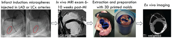 At the end of the in vivo MRI exam and before euthanasia, subjects were injected with a double dose of gadolinium-based contrast agent ( 0.6 mL / kg gadopentetate dimeglumine and 10 mL of saline solution). Euthanasia solution ( 0.1 mL / lb , Euthasol®, Virbac, Carros, France) was administered after 10 min to allow the circulation of the contrast agent. Hearts were then extracted, rinsed, and prepared for ex vivo imaging. To preserve ventricular geometry, the hearts were inserted into 3D-printed molds based on images acquired at mid-diastasis [19]. Subsequently, the hearts and molds were submersed in Fomblin perfluoropolyether (PFPE), and ex vivo imaging was conducted with a knee coil. On an average, ex vivo imaging began 2.5 h after euthanasia. A simplified flowchart summarizing the experimental procedure is shown in Figure 1.