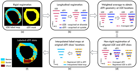 Finally, the resultant LGE-based label maps were applied to the original cDTI slices via 3D interpolation (Figure 2e).