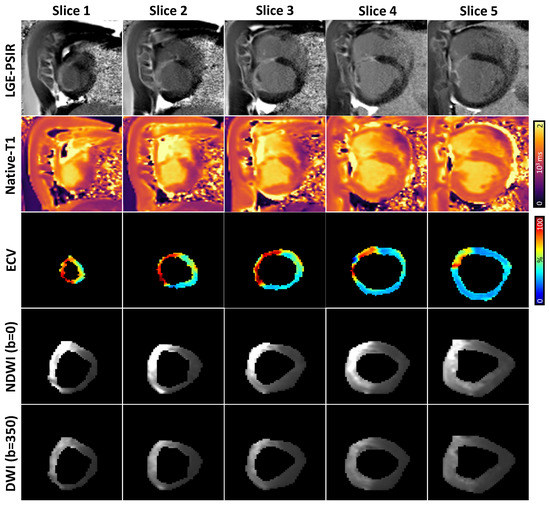 Figure 3. LGE-PSIR, native T1, ECV maps, b = 0 s/mm 2 , and b = 350 s/mm 2 images for five representative short-axis slices of the same infarcted swine subject. LGE-PSIR is a contrast-based imaging technique, and native T1 and diffusion images (NDWI and DWI) are non-contrast-based techniques.