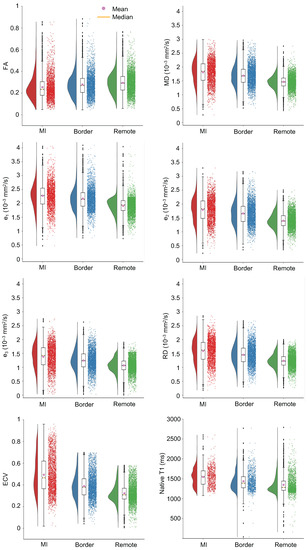 Figure 5. Raincloud plots [28] overlaid to the corresponding box plots for FA, MD, eigenvalues e 1 , e 2 , and e 3 , radial diffusivity (RD), extracellular volume fraction (ECV), and native T1 in the infarct, border, and remote myocardial regions.