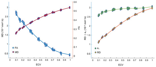 The results computed from experimental data concur with the findings of particle diffusion simulations. From the diffusion simulations, as ECV increases, e 1 , e 2 , e 3 , and MD increase, and FA decreases. These trends agree with previous studies [42] and remain consistent regardless of the number of simulated water molecules (from four to thirty thousand water molecules per representative volume), length of adopted time step (from 10 5 s to 10 7 s ), and cell structures (10 to 45 cell structures have been simulated). Additionally, as ECV increases, simulated e 2 and e 3 values increase at a higher rate with respect to e 1 .