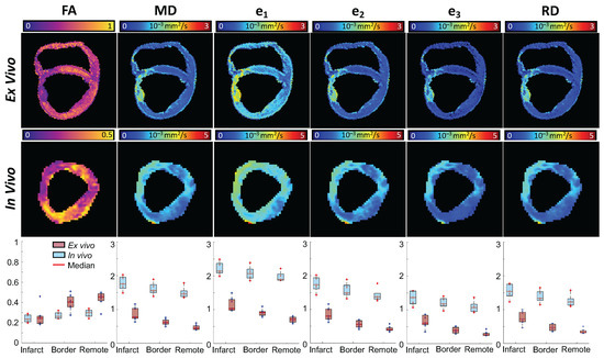 The median e 1 , e 2 , e 3 , and RD values computed using ex vivo data (values computed using in vivo data in this study are in parenthesis) were, respectively: 1.16 (2.28) × 10 3 mm 2 /s for e 1 , 0.88 (1.83) × 10 3 mm 2 /s for e 2 , 0.72 (1.42) × 10 3 mm 2 /s for e 3 , and 0.79 (1.62) × 10 3 mm 2 /s for RD, in the infarct region; 0.91 (2.14) × 10 3 mm 2 /s for e 1 , 0.55 (1.65) × 10 3 mm 2 /s for e 2 , 0.39 (1.24) × 10 3 mm 2 /s for e 3 , and 0.47 (1.45) × 10 3 mm 2 /s for RD, in the border region; 0.70 (1.94) × 10 3 mm 2 /s for e 1 , 0.41 (1.38) × 10 3 mm 2 /s for e 2 , 0.28 (1.06) × 10 3 mm 2 /s for e 3 , and 0.35 (1.22) × 10 3 mm 2 /s for RD, in the remote region.