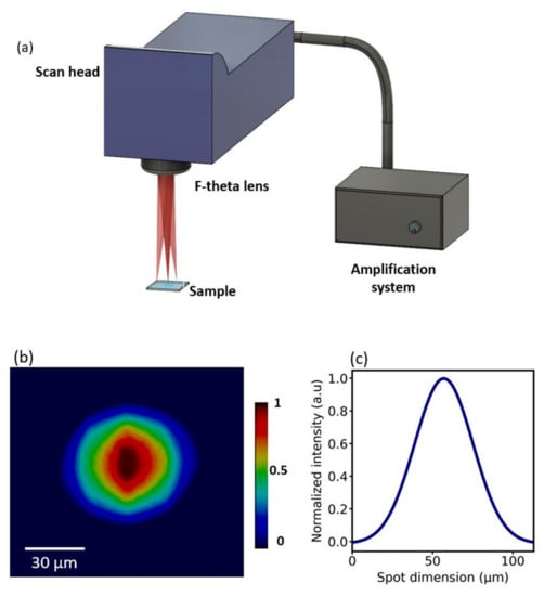 (a) Schematic diagram of the laser system with a fast scanning galvanometric head; (b) representation of the intensity distribution of the laser close to focal plane (colorbar represents normalized intensity); (c) plot of normalized intensity along the beam cross-section.
