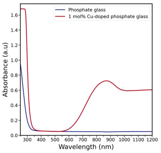 Pure calcium phosphate glass does not appreciably absorb in the near-infrared (NIR) region. Doping the glass matrix with copper metal ions essentially reduces the absorption bandgap. This increased absorption in the IR could be attributed to the presence of Cu2+ ions in octahedral coordination facilitating intra-configuration (d-d) transitions [,]. The measured UV-Visible absorption spectra for the fabricated glasses reported in Figure 2 are coherent with the aforementioned effect of copper-ion doping into the glass matrix. Indeed, an apparent enhancement in optical absorption was observed at NIR wavelengths. It was also observed that the absorption enhancement at deep UV, i.e., ~300 nm, was much greater than that at NIR wavelengths. However, this study envisages the possibility of using an industrial-grade IR ns-laser (λ = 1064 nm) instead of more expensive UV ns or pico-second/femto-second (ps/fs) lasers.