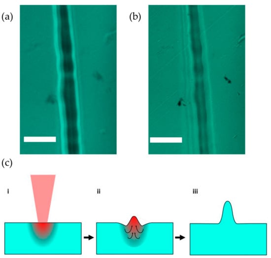 Upon focusing between the reference glass surface plane and the laser modification line, it is possible to see that the generated features along the laser scan line are in the form of protrusions above the reference glass surface plane as confirmed by the profilometer analysis presented later. The formation of micro-protrusion features, as depicted in Figure 3c, has an inherent relationship to the Gaussian energy distribution of the pulse and the temperature coefficient of surface tension dγ/dT of the glass. The Gaussian energy distribution would generate highest temperature at the center of the molten pool. Laser pulse interaction at the surface would cause rapid vaporization of the material, inducing a recoil pressure. The commonly observed micro-concave features after laser ablation are attributed to this recoil pressure. On the contrary, micro-protrusion features were obtained in the current study. This could be explained by a positive temperature coefficient of surface tension, which would mean the highest surface tension would be present at the center of the molten pool []. The temperature gradient of melt pool as a result of the Gaussian energy distribution of the pulse would thus cause a radially inward flow of the melt owing to inverse Marangoni flow [,,]. To finally result in the observed protrusion features, the radial inward flow must overcome the recoil pressure effect caused by rapid vaporization. This inward flow drives the upward expansion of molten glass at the center of the melt forming the microfeatures on rapid cooling, as depicted in Figure 3c.