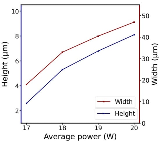 Figure 5 presents the height and width of the protrusions for different average laser powers. It can be seen that they increase almost linearly with the laser power. In this study, the upper limit for average laser power was fixed at 20 W due to the inherent maximum permissible average power limit of the laser system.