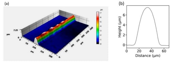 Profilometer generated 3D view (a) and cross-section (b) of a modification line written at 19 W and 3 mm/s.