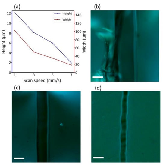 (a) Height and width of the modified lines at different scan speeds at 19 W average power. Micrographs of laser modifications at scan speeds of (b) 1, (c) 3, and (d) 5 mm/s at an average power of 19 W. Scale bar represents 50 μm.