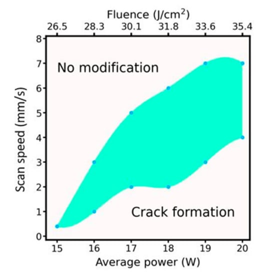 After characterizing the surface modification for laser parameters of average power and scan speed, it was necessary to define an optimal processing regime for a combination of the studied laser parameters. This provided a more complete characterization and also a reference for fabricating clean surface processing, devoid of cracks or other undesired surface features. For studies related to laser processing, a general parameter of importance is the laser fluence (F), defined according to Equation (1) as the energy delivered by pulse per unit area: