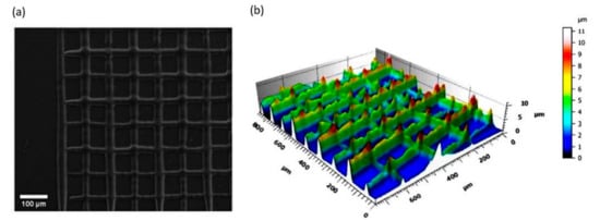 The relation depicted in Figure 8 between the laser power and the laser scan speed for surface processing is coherent with thermal-based effects resulting in the surface texturing of the Cu-doped calcium phosphate glass. Having an idea of the optimal processing parameter window paves the way towards more advanced patterning to obtain more complex and functional surface textures without thermally induced cracks. As a test to demonstrate the patterning capabilities of the laser texturing on the glass, we defined a grid pattern at a power of 17 W and a scan speed of 2 mm/s. Figure 9 shows the SEM and profilometer analyses of an optimal surface modification. Such a grid texture with an average height of 7 μm can be employed as a surface for scaffolding cells. Even more geometrically complex structures can be generated and transferred with the laser controller, thus providing a powerful tool to easily explore the effect of different geometrical textures of this bioglass on the growth of cells and other biomedical applications.