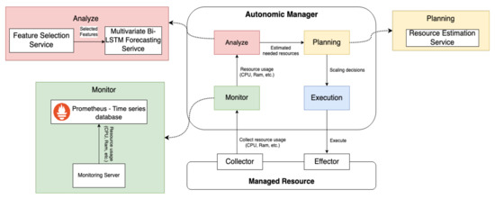 In time series forecasting, a multivariate prediction model usually consists of multiple feature values at each time step. The collector component collects the resource utilization data of multiple features such as the CPU, memory, disk I/O, and network received throughput. All the collected data are sent to the monitor server of the autonomic manager.