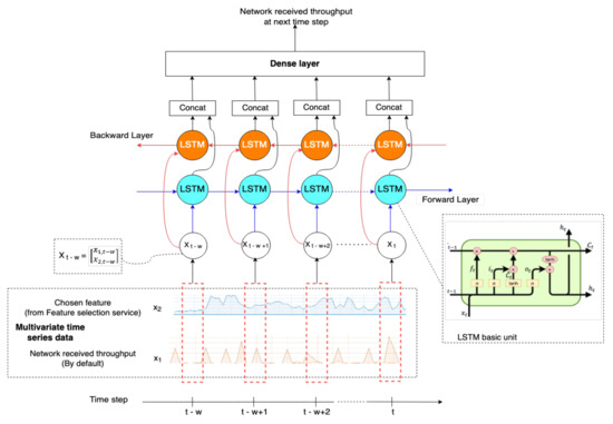 - Multivariate Bi-LSTM forecasting service:Time series forecasting takes the historical time series data as the input and outputs the future temporal value at time step or at time step . The model is fed data that include the variable itself and other multivariate time series variables. Using the network received throughput as an example, the model not only includes the network received throughput, but also includes other features such as CPU usage, memory usage, and disk I/O. Network received throughput refers to the amount of data that can be received from the source to the destination within a given time frame. The number of packets that successfully arrive at their destinations is measured by the throughput. Throughput capacity is usually expressed in bits per second, although it can be alternatively expressed as data per second. By predicting the network received throughput, we can estimate the number of incoming packets to our system and better provision or deprovision resources (VMs) to process those packets. For this reason, in this study, we chose the network received throughput as the desired prediction metric for preparing the scaling action described in the planning phase in Section 3.2.3.As expressed in Equation (2), the multivariate forecasting model in this paper attempts to predict the value at the next time step , given a history of multivariate time series dataset in the past, where i and w denote the numbers of features and historical time step data, respectively. The proposed model comprises two features: the network received throughput and the feature with the highest correlation chosen from the feature selection service above.The multivariate Bi-LSTM forecasting service proposed in this paper collects historical metric data with size w from the Prometheus time series database. Then, the trained model uses the current collected data to predict the data at the next time step of the network received throughput, .Although the dependencies of long-term states can be established theoretically, an RNN can only learn short-term dependencies because of the gradient vanishing problem [24]. This problem is called long-term dependence. LSTM is a special type of RNN. It was proposed by Hochreiter and Schmihuber in 1996 [25] to solve the RNN problem. Furthermore, it is used in various fields, including weather forecasting, image processing, video analysis, and time series forecasting. The long-term temporal dependence properties of time series data can be learned successfully using LSTM [25]. A typical LSTM unit consists of five components, as shown in the right corner of Figure 2. The inputs of the multivariate Bi-LSTM model include two features: and , which are the network received throughput and the chosen feature from the feature selection service. Each red dashed box area presents a matrix of time series data of both input features at a specific time step. For example, the red dashed box area of is a matrix [, ] that contains two separate historical time series data of features and , respectively, at time step . We use and to respectively denote the input gate, forward gate, memory cell, output gate, and hidden state of a basic LSTM unit. The gates and memory cell of the LSTM unit allow it to memorize or forget information.