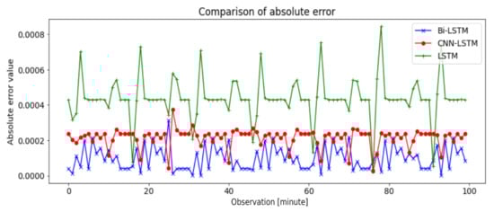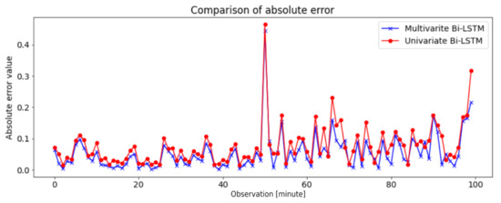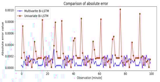 Figure 4. Absolute error for the first 100 observations of univariate and multivariate Bi-LSTM models using the GWA-T-12 dataset.Table 6 also indicates that the multivariate Bi-LSTM model had smaller prediction error values for the MAE, MSE, and RMSE metrics than those of the multivariate LSTM and CNN-LSTM models. Moreover, the multivariate Bi-LSTM had better accuracy than those of the other models. We plotted the absolute error values of the first 100 observations using different multivariate prediction models, as shown in Figure 5. In the figure, we can clearly see that the multivariate Bi-LSTM had smaller absolute error values in all 100 observations. This proves that the time series data in the forward direction do not provide effective information other than to integrate the backward direction of the time series, causing the LSTM and CNN-LSTM models to become less effective;