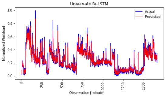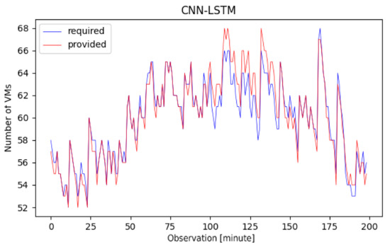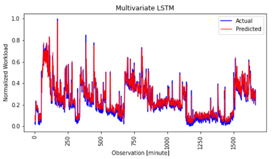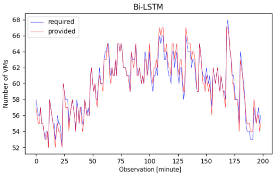 Finally, we simulated the environment to evaluate the resource provisioning efficiency of the proposed multivariate Bi-LSTM autoscaler compared with those of other multivariate deep-learning-based autoscalers, as mentioned above. In this experiment, we used the first 200 observations in the testing set of the GWA-T-13 dataset to estimate the resource provision efficiency of each multivariate model. In addition, we assumed that each VM could handle 3300 KB/s of network received throughput, , and that the workload was balanced between VMs.