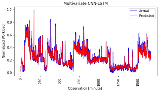 Cloud computing is currently playing a significant role in improving the efficiency of enterprises, industries, and governments [1,2]. Virtualization technology, which allows cloud providers to execute programs on virtual machines (VMs), is an essential component of cloud computing [3]. By renting VMs, stakeholders can deploy their applications on the VMs using pay-per-use prices instead of purchasing expensive physical servers. Elasticity is a key property of cloud computing as it allows cloud providers to create and remove resources as needed, increasing performance, while lowering costs [4]. Autoscaling is an automatic process that dynamically adds and removes resources such as VMs and containers. Autoscaling can be categorized into two types: reactive and proactive. Reactive autoscaling refers to processes that scale resources based on predefined rules or thresholds, whereas proactive autoscaling analyzes and predicts future workloads based on historical data. It then generates scaling decisions based on the predicted workloads. Reactive autoscaling has the advantage of its ease of implementation, but has a significant disadvantage in that it cannot handle the change in workload, leading to a waste of resources, which affects service level agreements and costs [5]. With the proactive approach, service providers can add or remove resources in advance. However, workload demands fluctuate continuously over time, which makes their prediction difficult. To address this problem, many studies have proposed a technique called time series forecasting [3,5,6,7,8,9,10,11]. However, most of these studies focused on univariate time series analysis, that is they only analyzed the measurement of a single feature (or variate or variable), such as CPU utilization or memory usage, and produced predictions. However, there are multiple features to be considered in the cloud system, some of which might have hidden correlations that depend on each other. Multivariate time series analysis can be used to study these hidden correlations. Thus, it helps the prediction model better understand the system and improve the prediction accuracy.