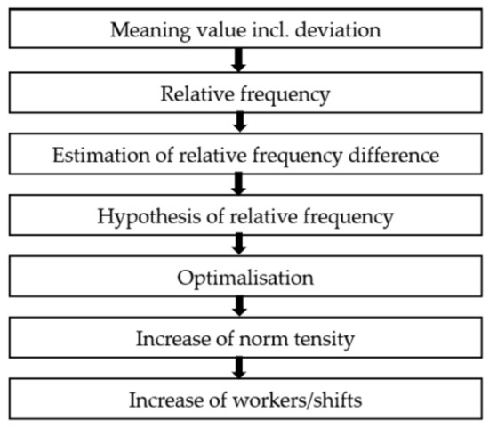 The applied statistical methods will explore the mean value prediction µ and the corresponding standard deviation s based on the random selection principle. By implementing the performance data to the construction software, we obtain the implementation time of the given process. The examination of the sample relative frequency with a 95% confidence interval will provide a percentage probability prediction of the fulfillment of the mean value range of the volume of the works conducted by individual workers during a selected period in relation to the duration of the given process. By testing the left-sided interval of the standard deviation, we achieved the longest process duration with the latest acceptable beginning of the subsequent activity. By implementing these data, we can obtain the pessimistic performance variant. The differences of the percentage prediction of the probabilities of fulfilling the range of the mean value related to the mutually technologically related building structures SO J12 and SO J34 will be compared using the test of the interval difference of the relative frequencies of two populations, using which we assess the necessity to increase the given capacities. A schematic illustration of the application of the statistical method is presented in Figure 2.