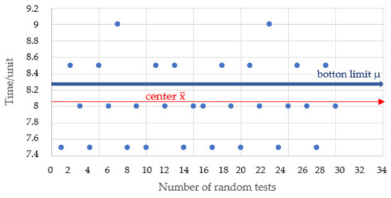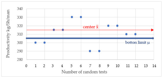 Due to the limited number of data (performances of 12 workers, see Table 1, the selected procedure corresponds to the number of the conducted random tests. To calculate the range of the mean value µ, i.e., to determine the given interval estimate, we proceed following mathematical Formula (2) stated in Section 3.2.1., utilizing the symmetry characteristics of the Student’s distribution. According to Section 3.2.2., the zero hypothesis was not rejected, i.e., that the data in the form of worker performances are subject to a standard distribution.