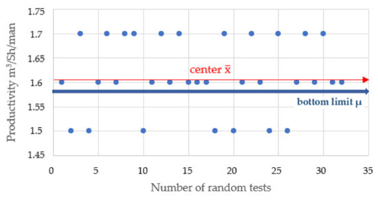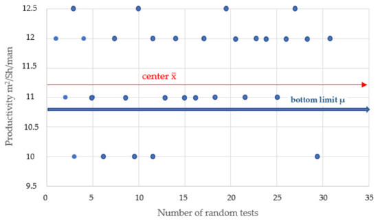 where p—the sample relative frequency of workers fulfilling mean value; π—the relative frequency; n—the total number of workers with a performance corresponding to one month; 1 − α—the confidence interval estimation = 0.95; α—the significance level; and zα—the selected quantile of the standardized normal distribution. The determination of the percentage of fulfillment of the mean value range µ with a 95% confidence interval, respectively, the performance standard per one month, provides important information based on which the given construction site management can adopt decisions related to strengthening the given capacities or increasing work productivity.