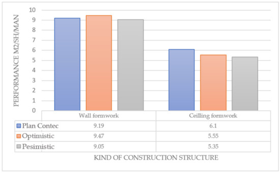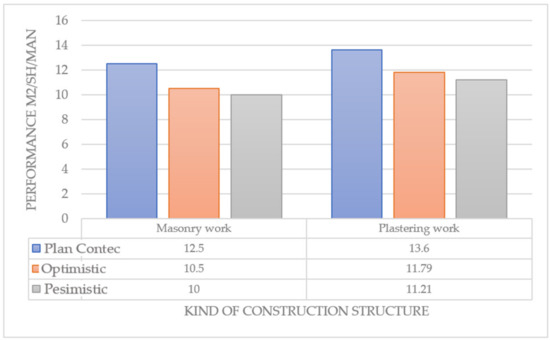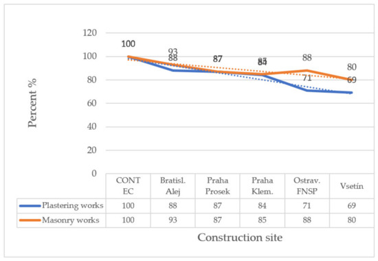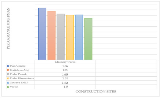 Examining the mean value of the performance of individual construction processes, such as reinforced concrete monolithic structures, masonry structures and plastering work are the subject of a number of publications. For example, publications dealing with formwork by Moholkar, M. and Patil, V. [72], Hanna, S. and Smith, G. [73] and Karthick, R. [74] can be mentioned. The performance of ironworks is discussed in publications [75,76]. The productivity of ceiling formwork is examined in publications. The productivity of masonry work is documented by Desale, V. and Deodhar, V. [77] Plastering work was the subject of a number of publications [78,79] in which comparable performance was achieved. The results of the average values of tiling work were presented by Idiake, E.J. [80].