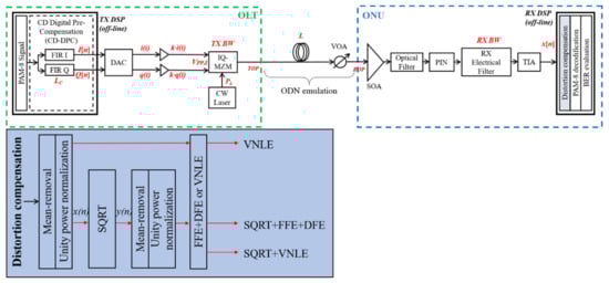 Next generation PONs must be backward compatible with legacy PONs, and the ODN must remain the same. Typically, at least a 29 dB link power budget (budget class N1) and a 0 to (at least) 20 km fiber reach must be guaranteed [1,2,3,4,22]. Regarding the trend of ITU-T PON standardization evolution, at least a 4-fold increment in DS capacity can be observed between 2 consecutive PON system generations [2,4]. For example, there is a 4-fold increment in DS capacity from a GPON (with DS 2.5 Gbps per λ) to XG(S)-PON (with DS 10 Gbps per λ), and a 5-fold increment from a XG(S)-PON to a higher speed PON (with DS 50 Gbps per λ). Therefore, it is expected that the next generation beyond 50G-PON will target (at least) 200 Gbps per λ in DS. To meet the 29 dB ODN loss and 20 km fiber reach at 100 Gbps is very challenging, as we showed in previous works [14,15,16,17]. For a 200 Gbps per λ transmission, the situation becomes extremely critical. In this paper, we focus on 200 Gbps per λ transmission in a C-band to guarantee 29 dB ODN loss over a 20 km fiber link, by combining the CD-DPC algorithm with two nonlinear distortion compensation techniques: the SQRT [16] and the Volterra nonlinear equalizer (VNLE) [17]. In [17], for 100 Gbps per λ transmission in a C-band, we experimentally showed a 1–2 dB gain in term of ODN loss by using VNLE when compared to the SQRT.