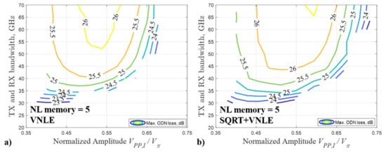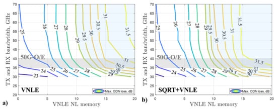 Although VNLE is an effective RX DSP option to compensate for linear and non-linear distortion, its complexity can be extremely high. The SQRT provides a marginal performance improvement but at the cost of a limited complexity enhancement by only 2 MPS. Thus, the SQRT can be used in combination with the VNLE to decrease the NL memory as well as maintain the desired system performance. For example, as shown in Figure 6, to achieve ≥29 dB maximum ODN loss by using 50G O/E, when the VNLE is applied alone, NL memory of 12 samples and 13 samples is required for TX and RX bandwidth of 40 GHz and 35 GHz, respectively, which corresponds to MPS of 1369 and 1668. For the SQRT + VNLE technique, NL memory of 9 samples and 11 samples is needed for TX and RX bandwidth of 40 GHz and 35 GHz, respectively, which corresponds to MPS of 706 and 1111, respectively.