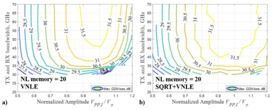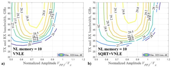 From Figure 2, Figure 3, Figure 4 and Figure 5, we can observe that the optimum normalized amplitude VPP,I/Vπ is in the range 0.55–0.60, 0.70–0.90, 0.90–1.00 and 1.00–1.10 for the VNLE NL memory equal to 5 samples, 10 samples, 15 samples and 20 samples, respectively. The optimum normalized amplitude VPP,I/Vπ increases as the NL memory increases. This can be explained considering the effect of the optical modulation index (OMI) on the nonlinearities generated in the modulation process. The OMI can be used to find the optimum operation point (at which the highest modulation levels can be obtained without introducing additional distortions) [32]. Smaller VPP,I/Vπ results in lower nonlinearity of the modulation, but also into a lower modulation level. In contrast, larger VPP,I/Vπ can result in a higher modulation level but also in stronger nonlinear effects of the modulation. Therefore, it is very important to set the optimum driving signal amplitude by optimizing the normalized amplitude VPP,I/Vπ. Without TX and RX bandwidth limitations and at the optimum VPP,I/Vπ, when the VNLE is applied alone, the maximum ODN loss of about 26.1 dBm, 29.1 dBm, 31.0 dBm, and 31.7 dBm can be reached for NL memory = 5 samples, 10 samples, 15 samples and 20 samples, respectively; when SQRT + VNLE is applied, the maximum ODN loss of about 26.6 dBm, 30.0 dBm, 31.7 dBm, and 32.0 dBm can be reached for NL memory = 5 samples, 10 samples, 15 samples and 20 samples, respectively. The VNLE can provide up to 3 dB improvement for every five samples additional NL memory, while the SQRT can provide about 0.5–1.0 dB improvement compared to the VNLE only option. However, the complexity of the VNLE is much higher than that of the SQRT (the complexity will be discussed and analyzed in detail in the following section). It is a trade-off between the system performance and the complexity of RX DSP options.
